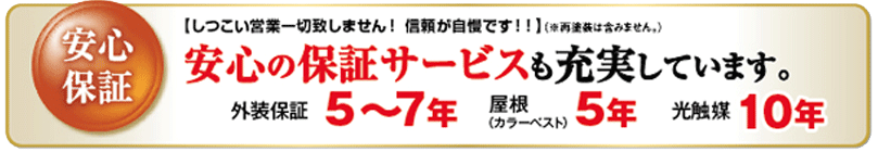 【しつこい営業一切致しません!信頼が自慢です!!】(※再塗装は含みません。)安心の保証サービスも充実しています。外装保証5~7年 屋根(カラーベスト)5年 光触媒10年