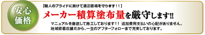 【職人のプライドに掛けて適正価格を守ります!!】メーカー積算塗布量を厳守します!!マニュアルを徹底して施工しております!!追加費用支払いの心配がありません。地域密着店舗だから、一生のアフターフォーローまで充実しております。