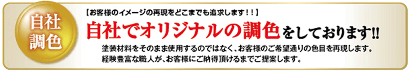 【お客様のイメージの再現をどこまでも追求します!!】自社でオリジナルの調色をしております!!マニュアルを徹底して施工しております!!塗装材料をそのまま使用するのではなく、お客様のご希望通りの色目を再現します。経験豊富な職人が、お客様にご納得頂けるまでご提案します。