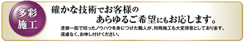 確かな技術でお客様のあらゆるご希望にもお応えします。塗装一筋で培ったノウハウを身につけた職人が、特殊施工も大変得意としております。遠慮なく、お申し付けください。